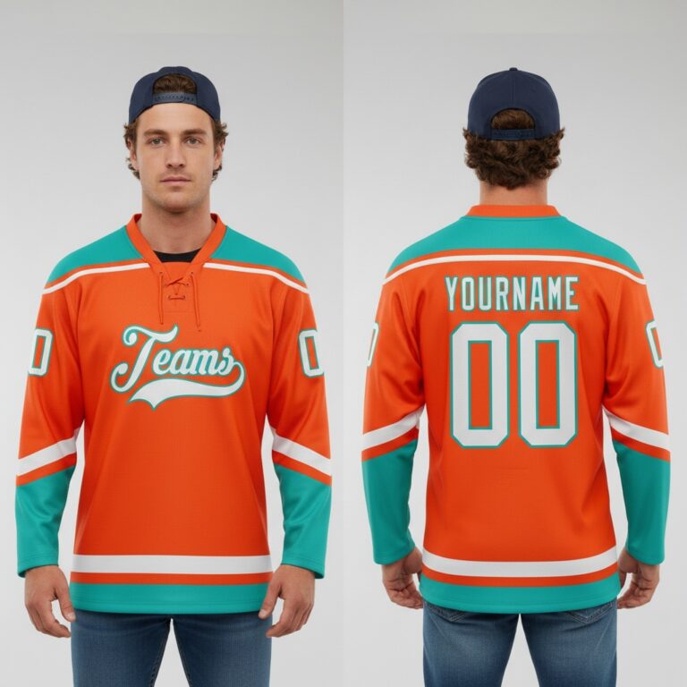 Experience unmatched team pride with our Custom Aqua Orange Hockey White Jersey. Designed for personalization, you can easily add your team’s logo, player names, and numbers to create a truly unique look. Crafted from breathable, moisture-wicking fabric, this jersey ensures lasting comfort and durability throughout every game and practice.
