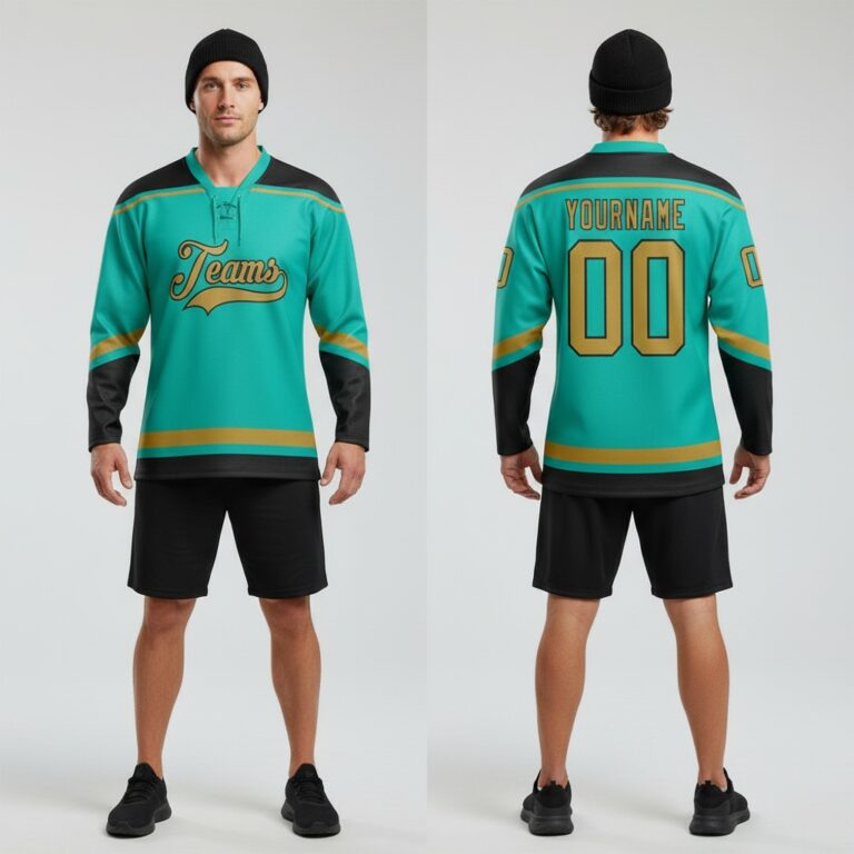 Elevate your team’s look with our Custom Black Aqua Hockey Old Gold Jersey, designed for ultimate personalization. Easily create your unique design by adding names, numbers, and logos that showcase your team’s identity. Crafted with breathable, moisture-wicking fabric, this jersey keeps players comfortable and focused during intense games.