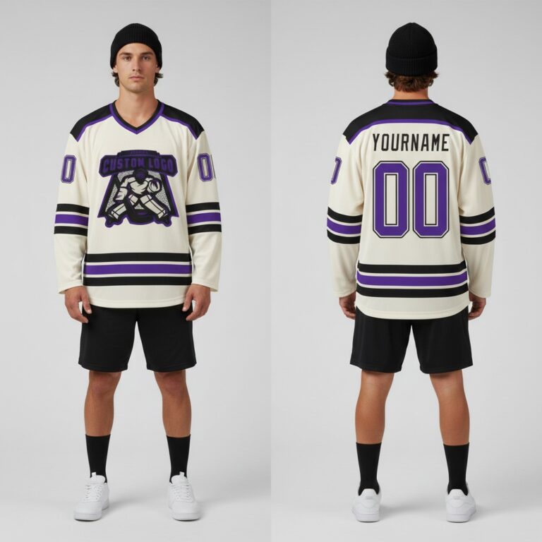 Experience the perfect blend of style and performance with our Custom Black Cream Hockey Purple Jersey. Designed for ultimate customization, you can add your team’s logo, player names, and numbers to create a unique look that stands out on the ice. The process is easy and ensures your team’s identity shines through every stitch.