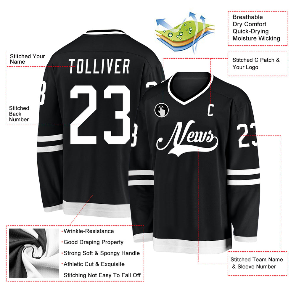 Experience the freedom to create your perfect Custom Black Hockey White Jersey with our easy design process. Add player names, numbers, and team logos to showcase your unique identity. Crafted from breathable, moisture-wicking fabric, this jersey ensures maximum comfort and durability on the ice, keeping your team cool and focused during intense gameplay.