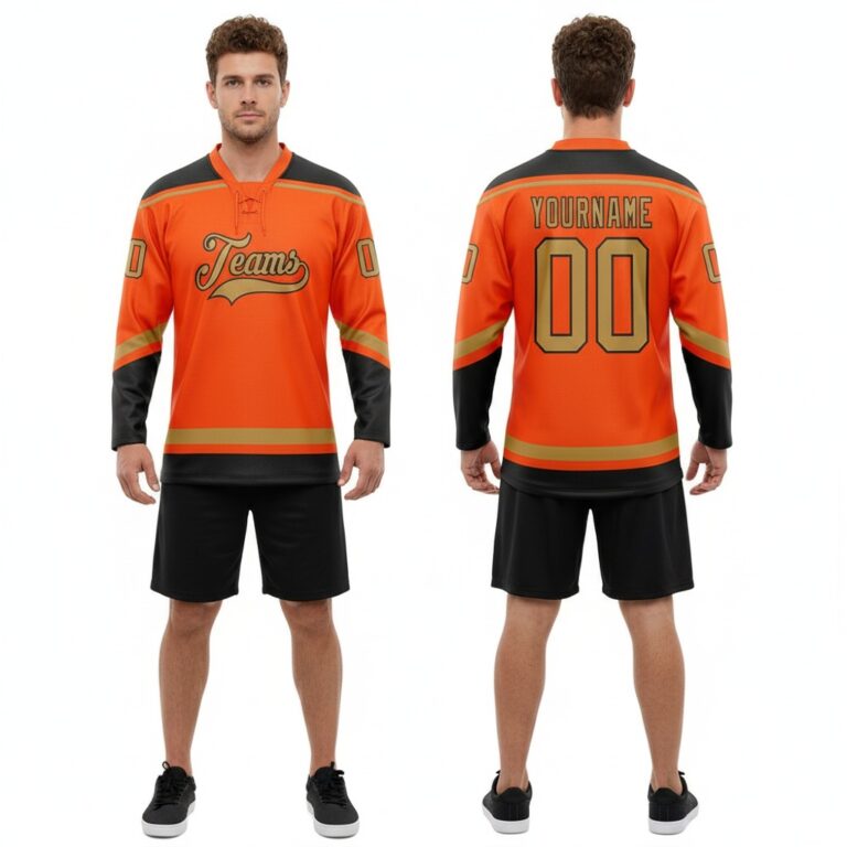 Experience the ultimate in personalization with our Custom Black Orange Hockey Old Gold Jersey. Easily design your own look by adding names, numbers, and logos that showcase your team spirit. Crafted from premium breathable and moisture-wicking fabric, this jersey ensures durability and comfort throughout every intense game.
