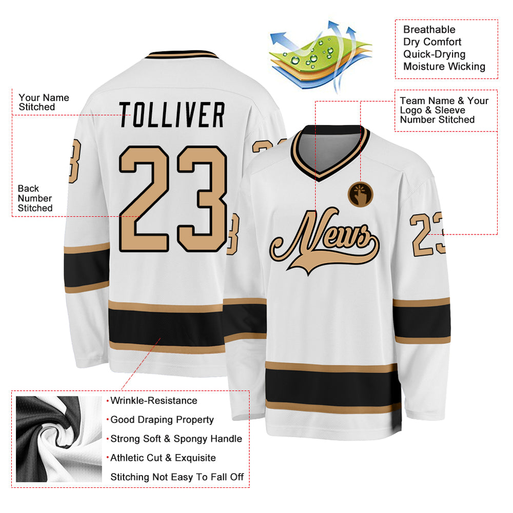 Experience the ultimate in personalization with our Custom Black White Hockey Old Gold Jersey. Tailor every detail from design to adding your team’s names, numbers, and logos, ensuring a truly unique look. Crafted from breathable, moisture-wicking fabric, this jersey promises durability and comfort during intense practice sessions.