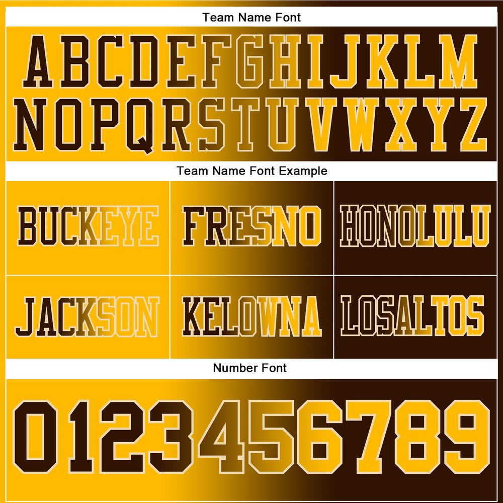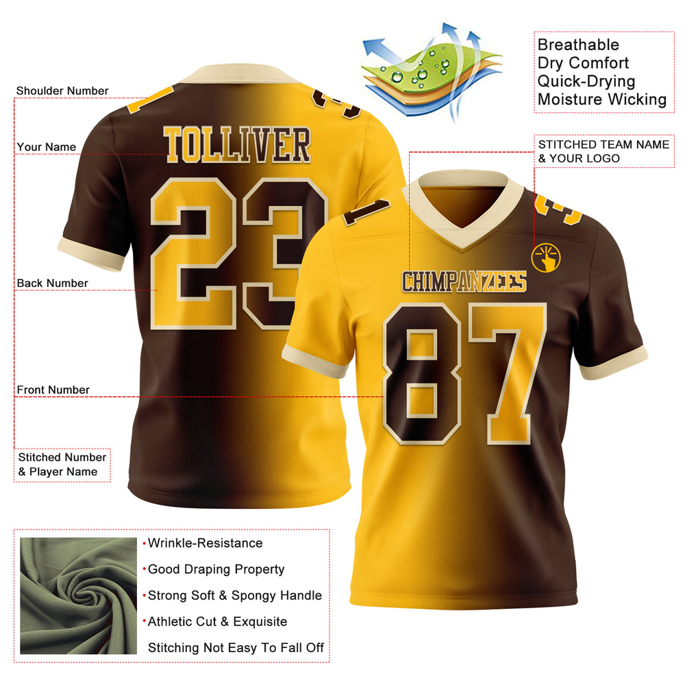Experience the ultimate in personalization with our Custom Cream Brown Football Gold Jersey. Easily design your jersey by adding names, numbers, and team logos to create a unique look that stands out on the field. Crafted from premium breathable and moisture-wicking fabric, this jersey ensures comfort and durability during every game.