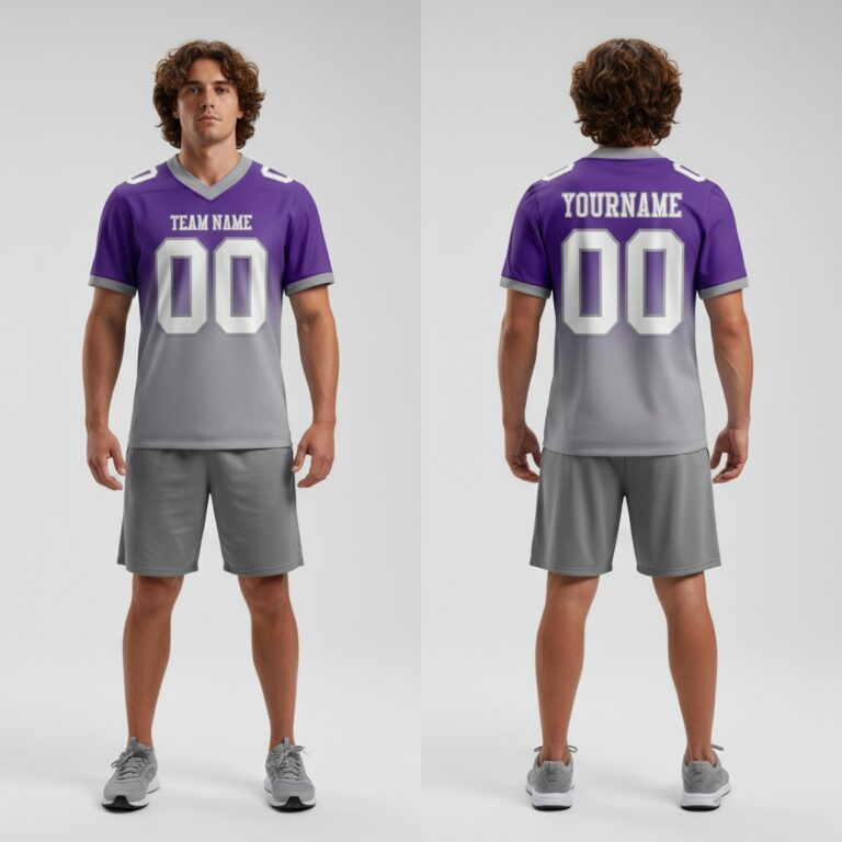 Elevate your team’s look with our Custom Gray Purple City Football White Jersey, designed for ultimate personalization. Easily create your unique design by adding names, numbers, and logos, ensuring every player stands out on the field. Experience a seamless customization process that brings your team’s vision to life with precision and style.
